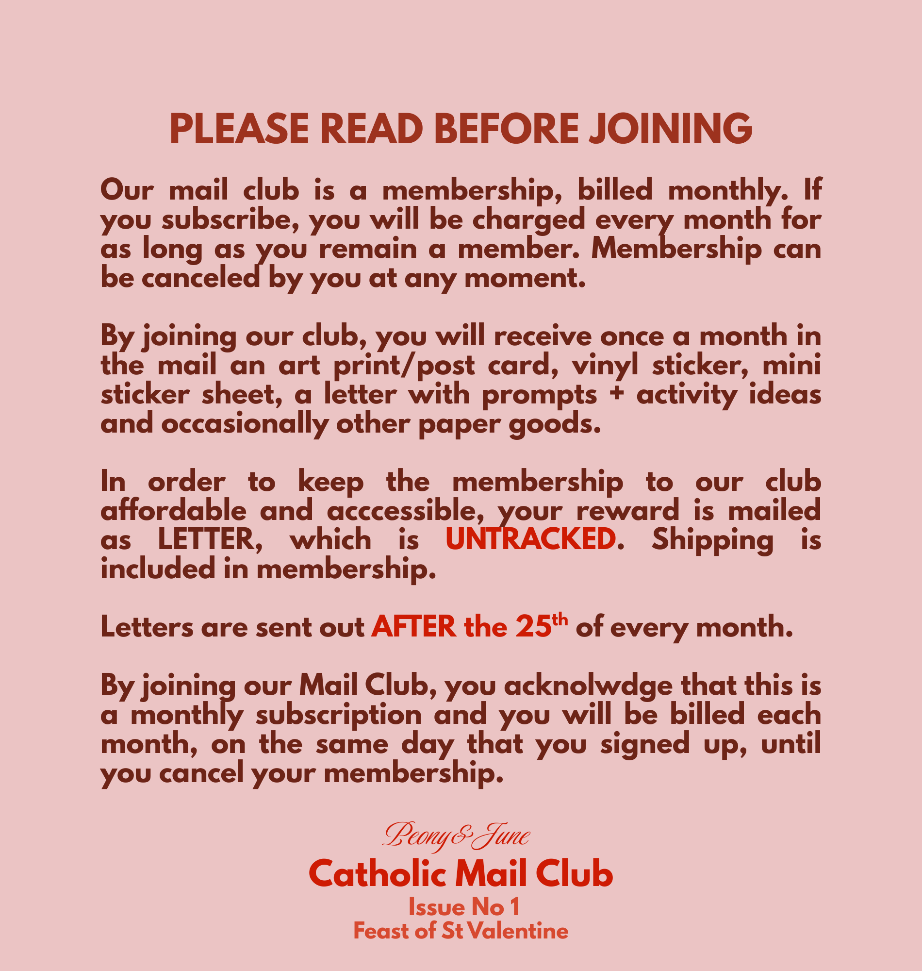 Our Catholic Mail Club was created from my desire to share art with my audience on a recurring basis and to have a form of communication outside of social media that feels personal and more connected. As a member of our Mail Club, you will receive Catholic art each month in the form of postcards, sticker sheets, vinyl stickers, and occasionally other paper goods.