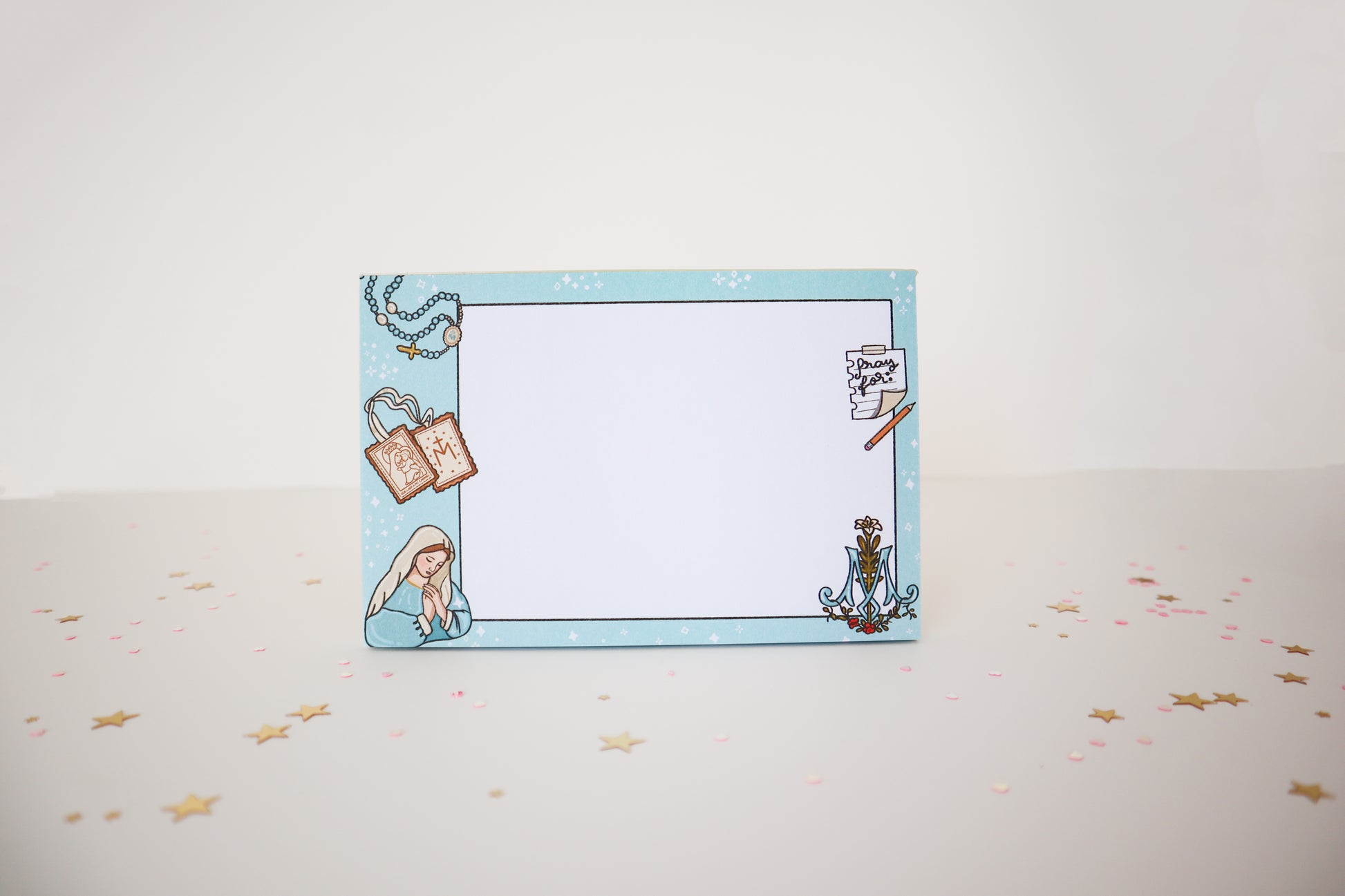 The Prayer Intentions notepad was born from my desire for a dedicated pad to write down intentions that I am asked to pray for, as well as my own intentions. It features illustrations of the Blessed Mother + marian symbols on a blue frame.
