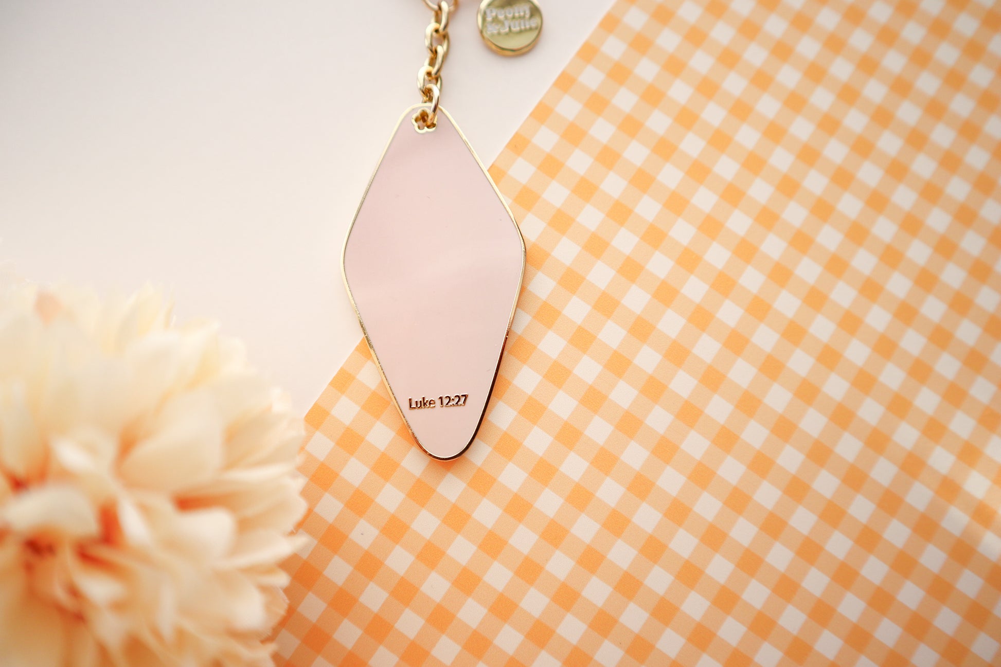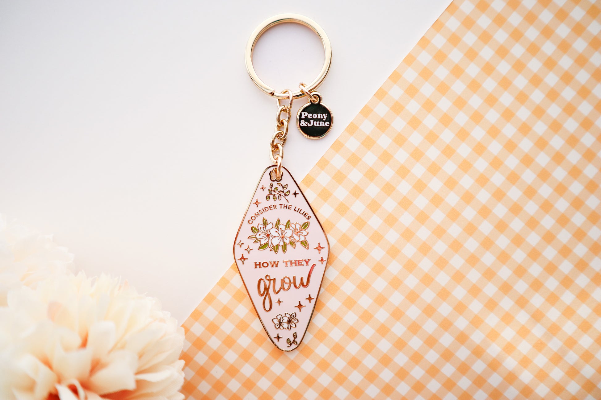 Enamel Keychain features the bible verse "consider the Lilies how they grow" along with the reference "Luke 12:27" on the back.