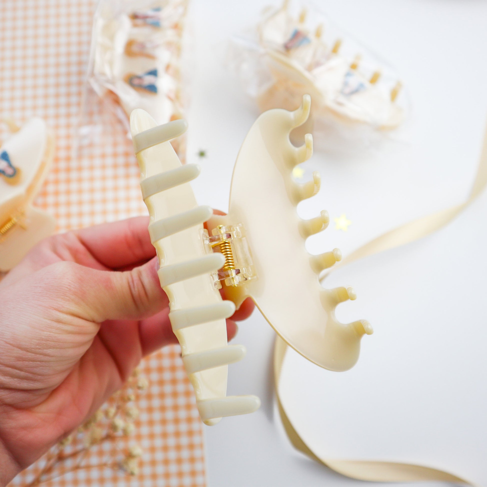 Tan clip with Blessed Mother charms attached to both sides of the clip. Makes a lovely gift for Catholic girlies in your life.
