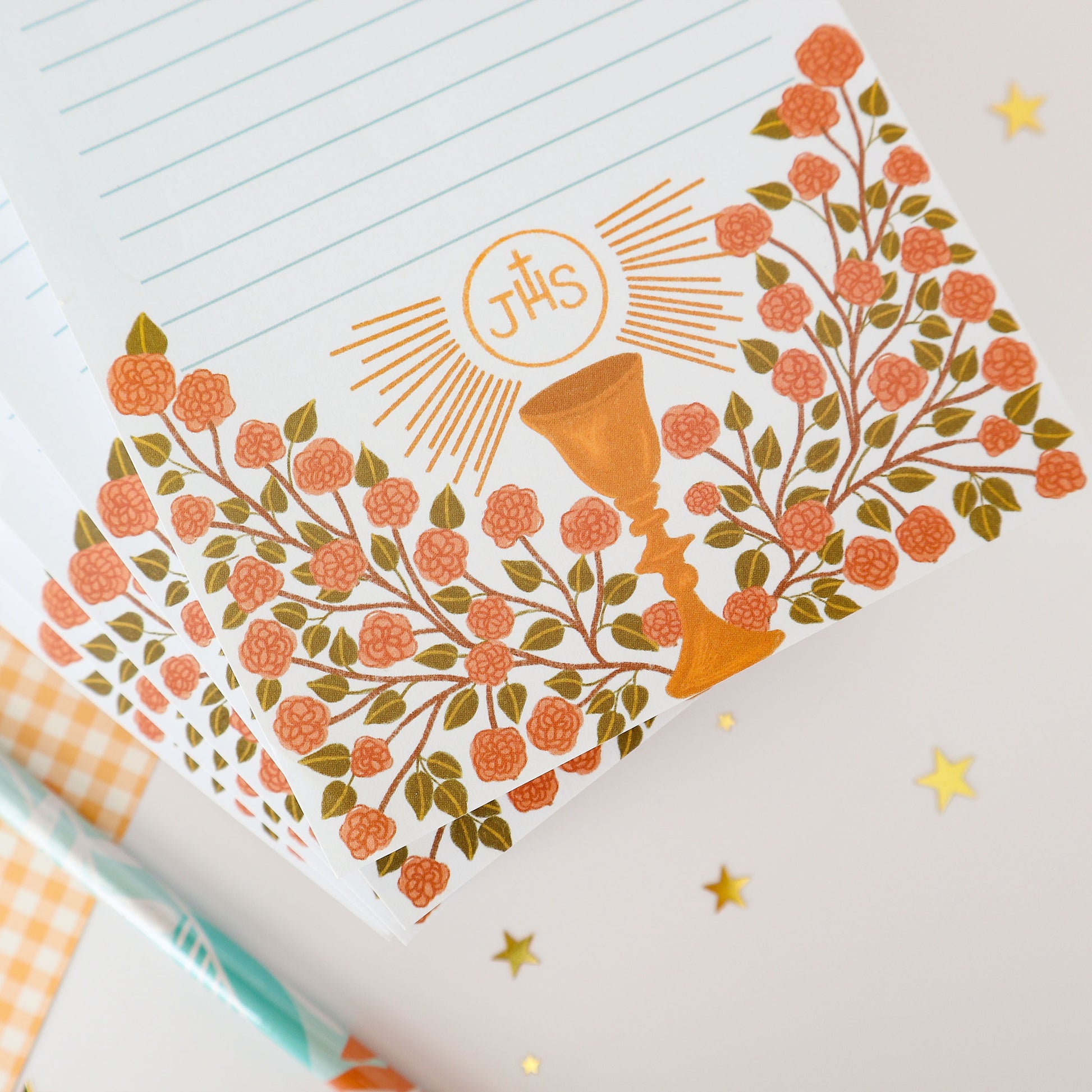 This notepad features illustrations of the Blessed Sacrament and florals.