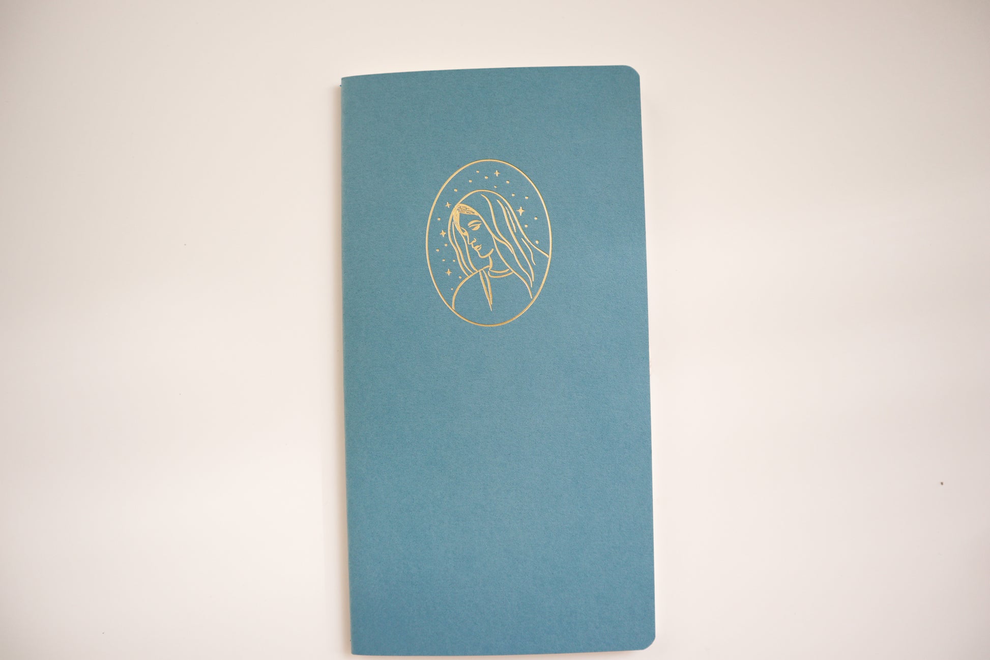 This TN size softcover Marian notebook features a gold foil engraved image of the blessed mother on the front cover on a blue background.