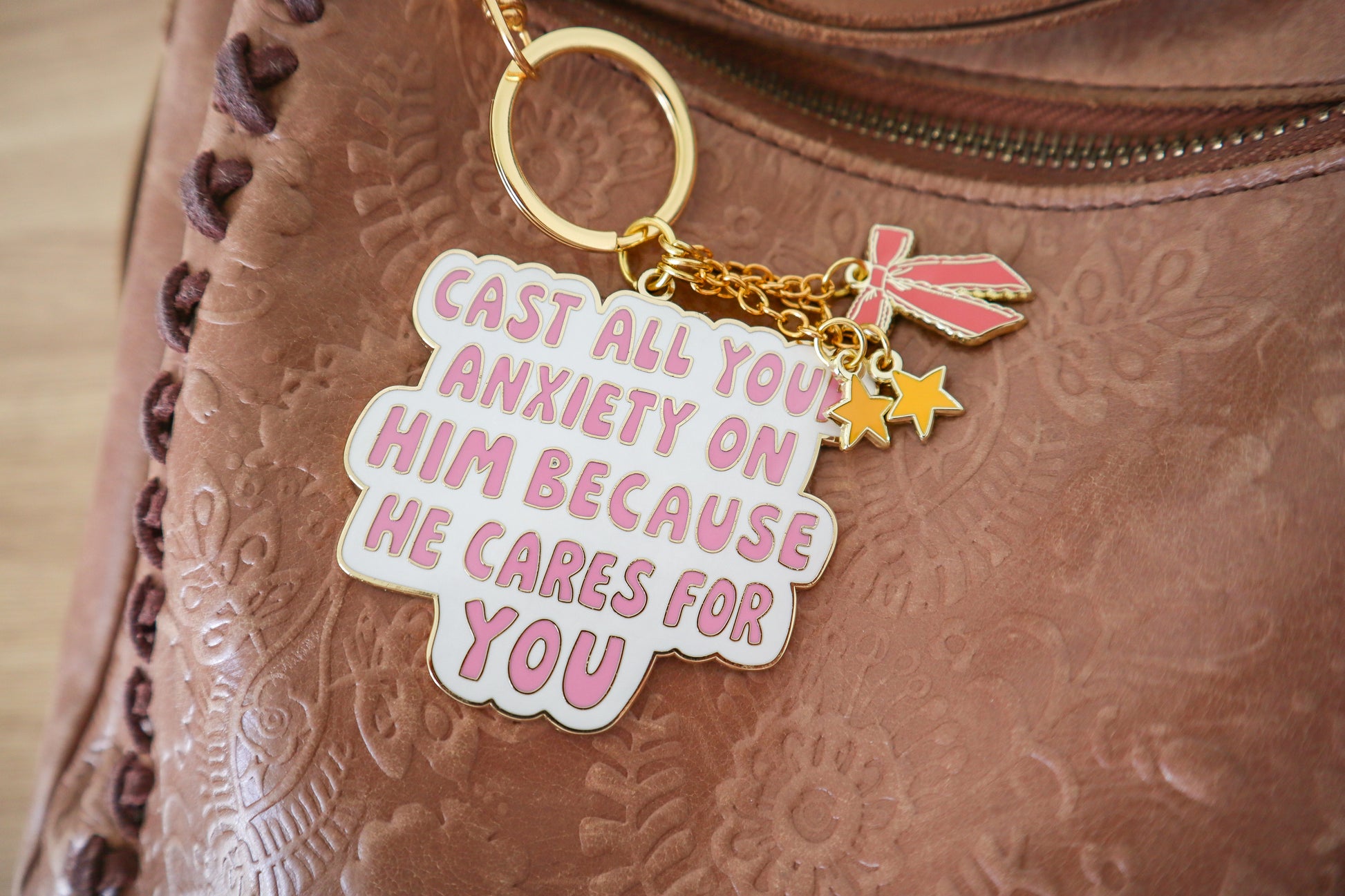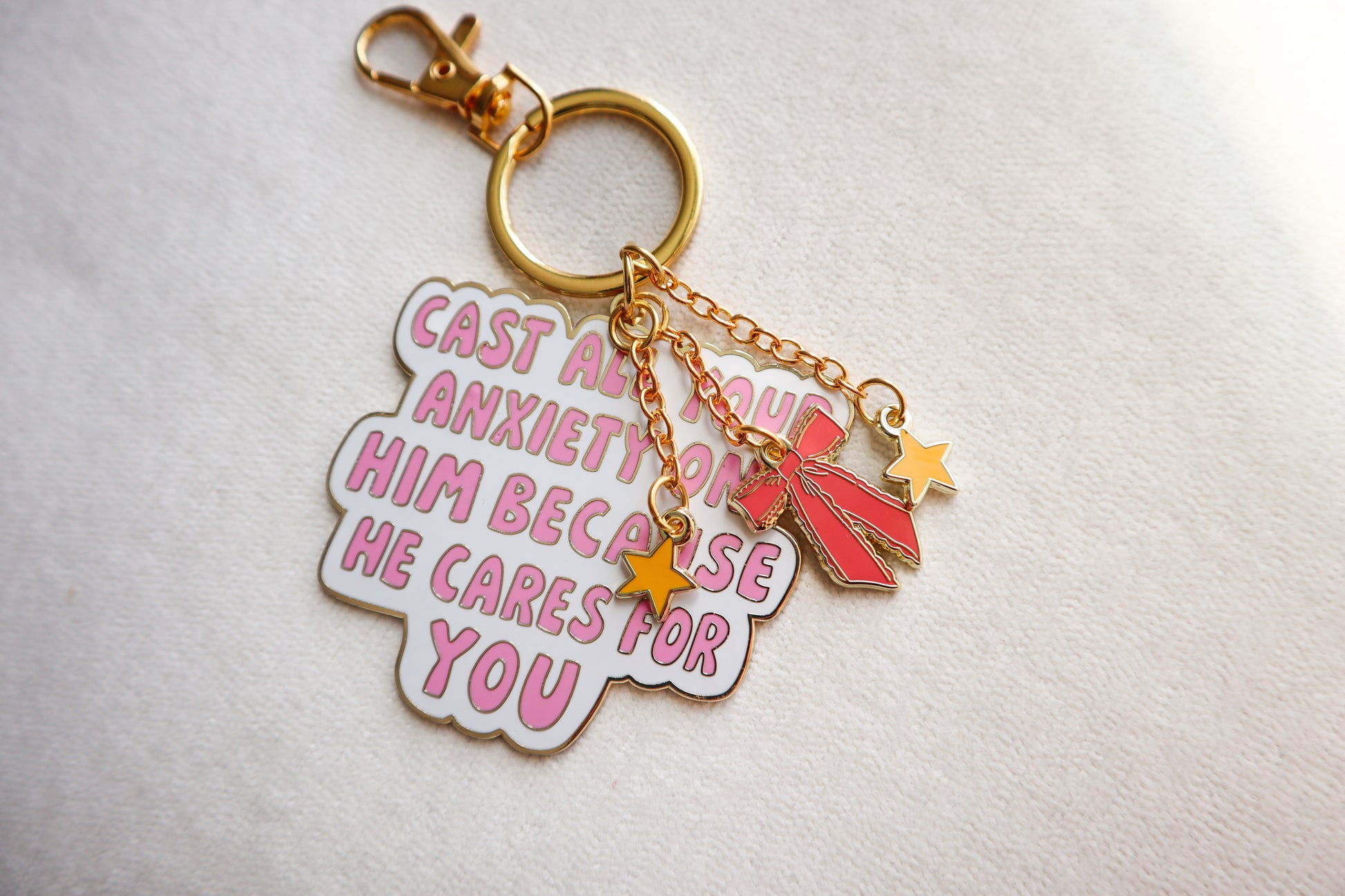 Enamel Keychain featuring the bible quote "Cast all your anxiety on him because He cares for you." from 1 Peter 5:7 and enamel charms.