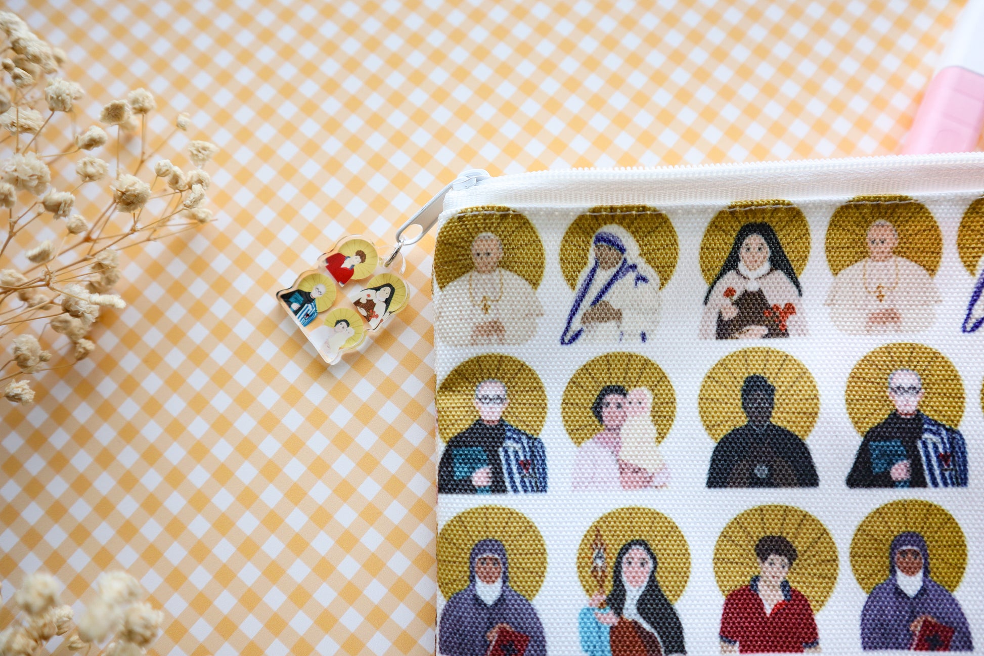 Catholic Saints Pencil Case features illustrations of Saints on a white background.
