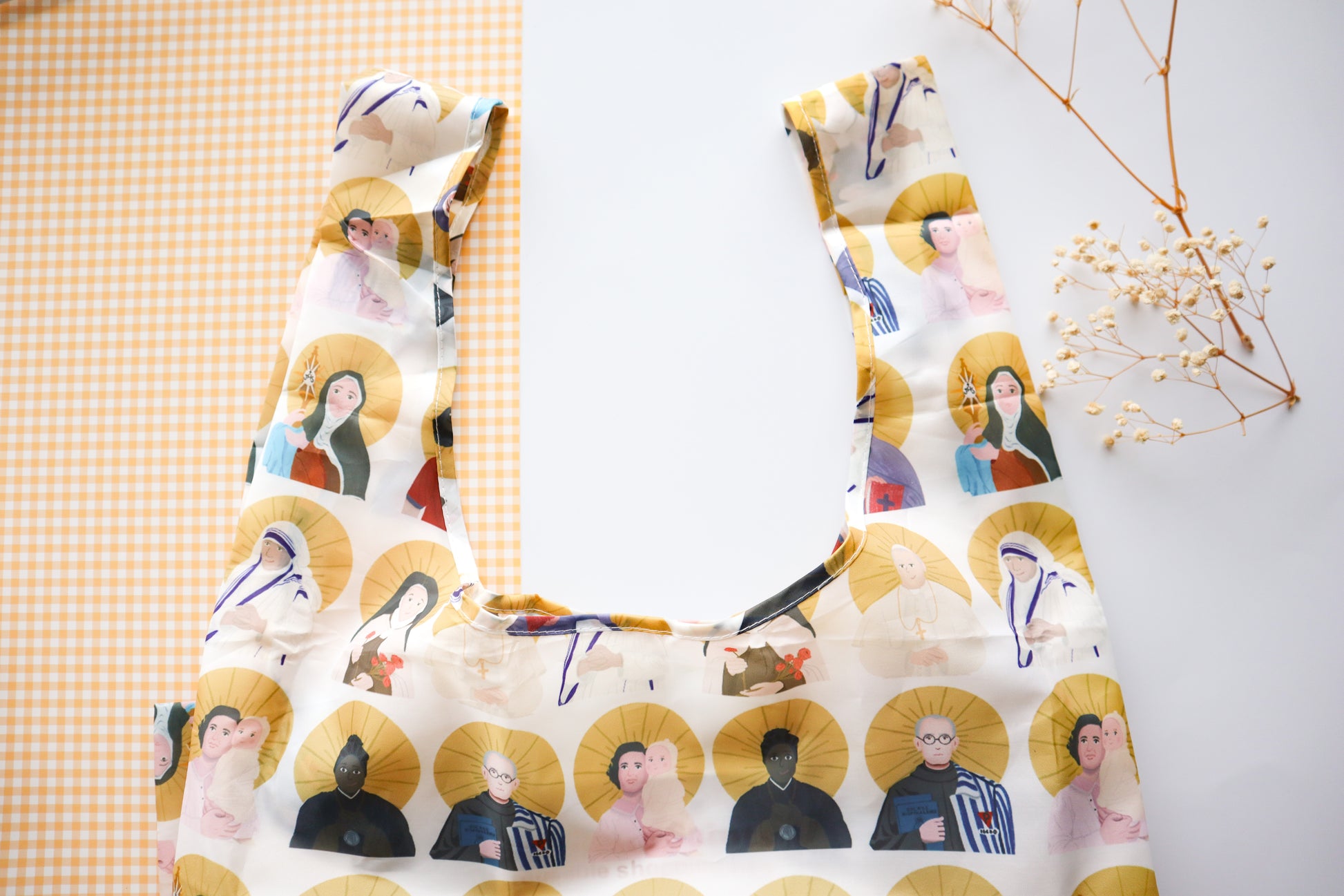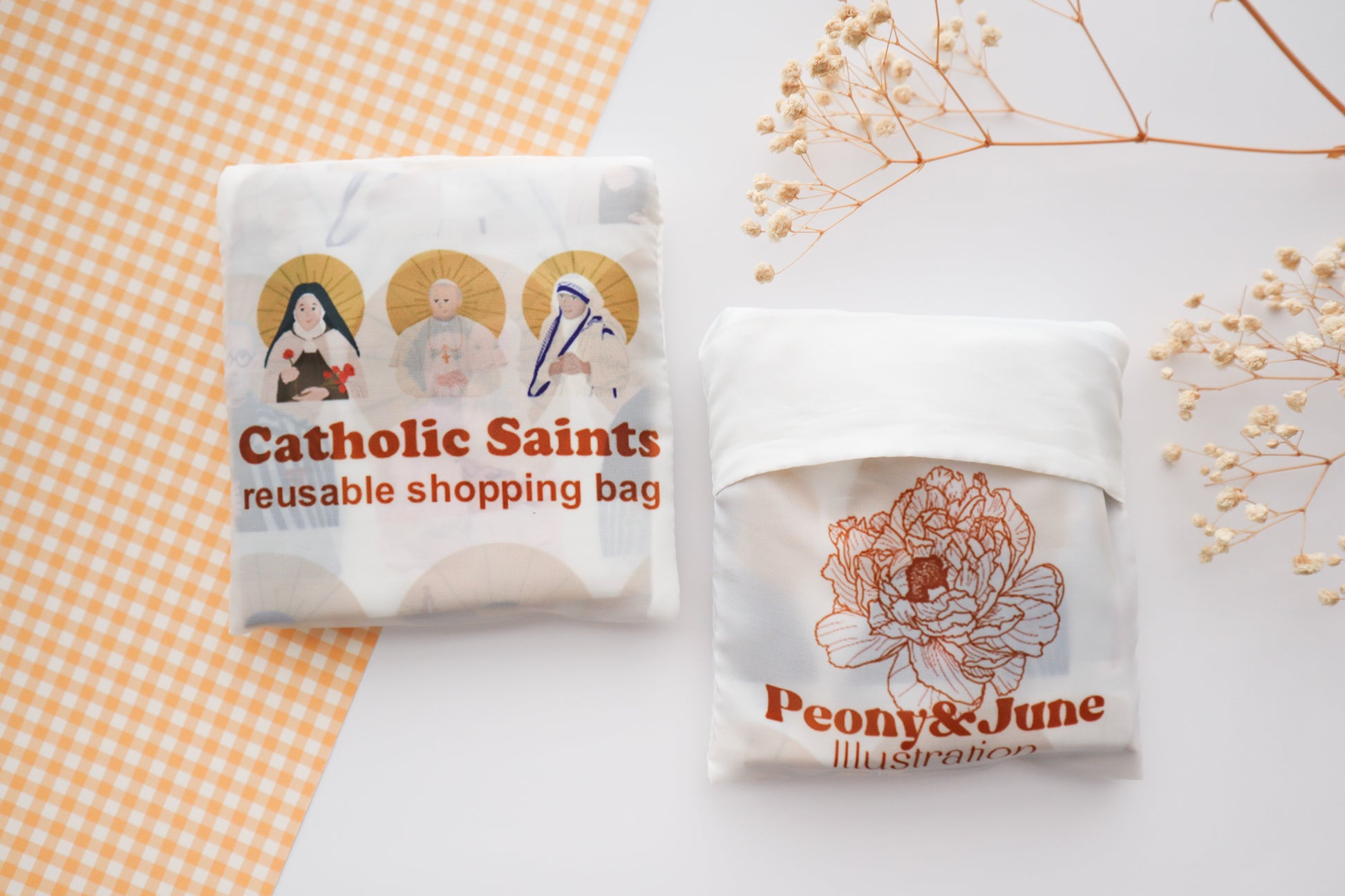 The Catholic Saints Shopping Bag features Illustrations of Catholic Saints on a white background.