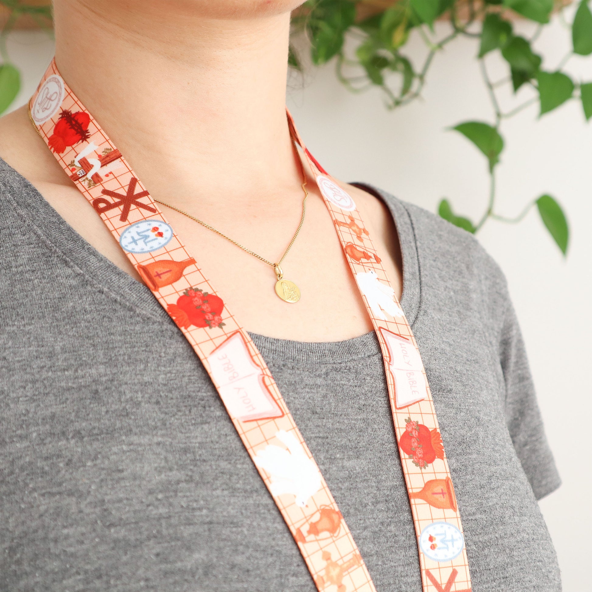 This lanyard features illustrations of Catholic Symbols such as the Holy Eucharist, the Chi Ro, Holy Hearts of Jesus + Mary, etc. It makes a lovely addition as a functional keychain.