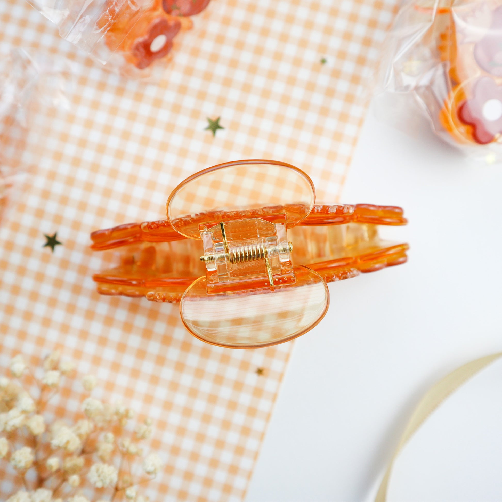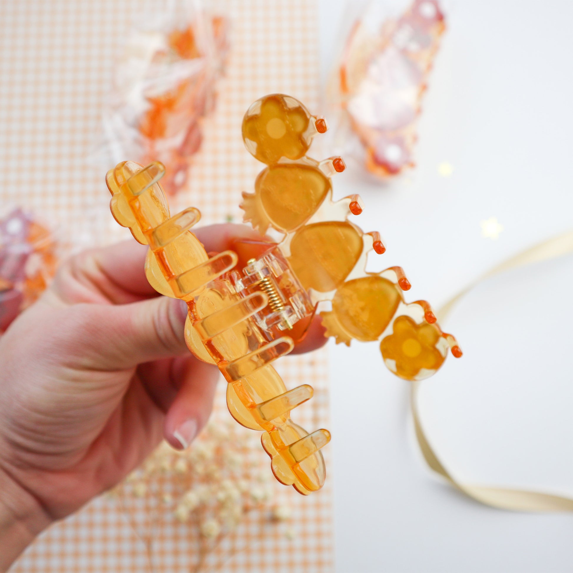 Transparent orange clip with charms representing The Sacred, Immaculate and Most Chaste Hearts attached to both sides of the clip. Makes a lovely gift for a loved one.