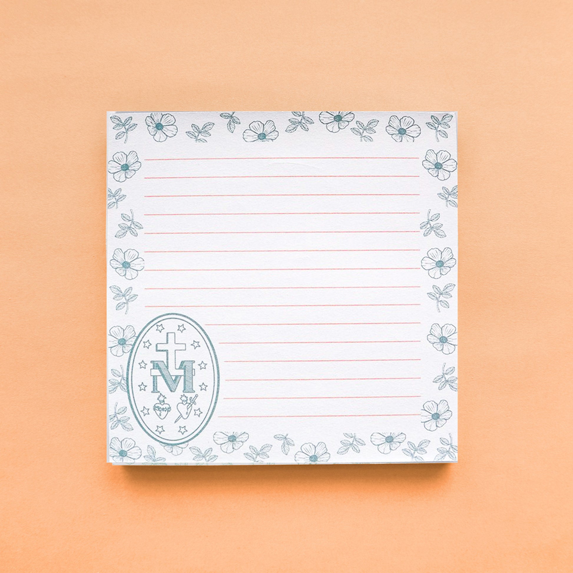 Marian sticky note features illustrations of the Miraculous Medal + florals