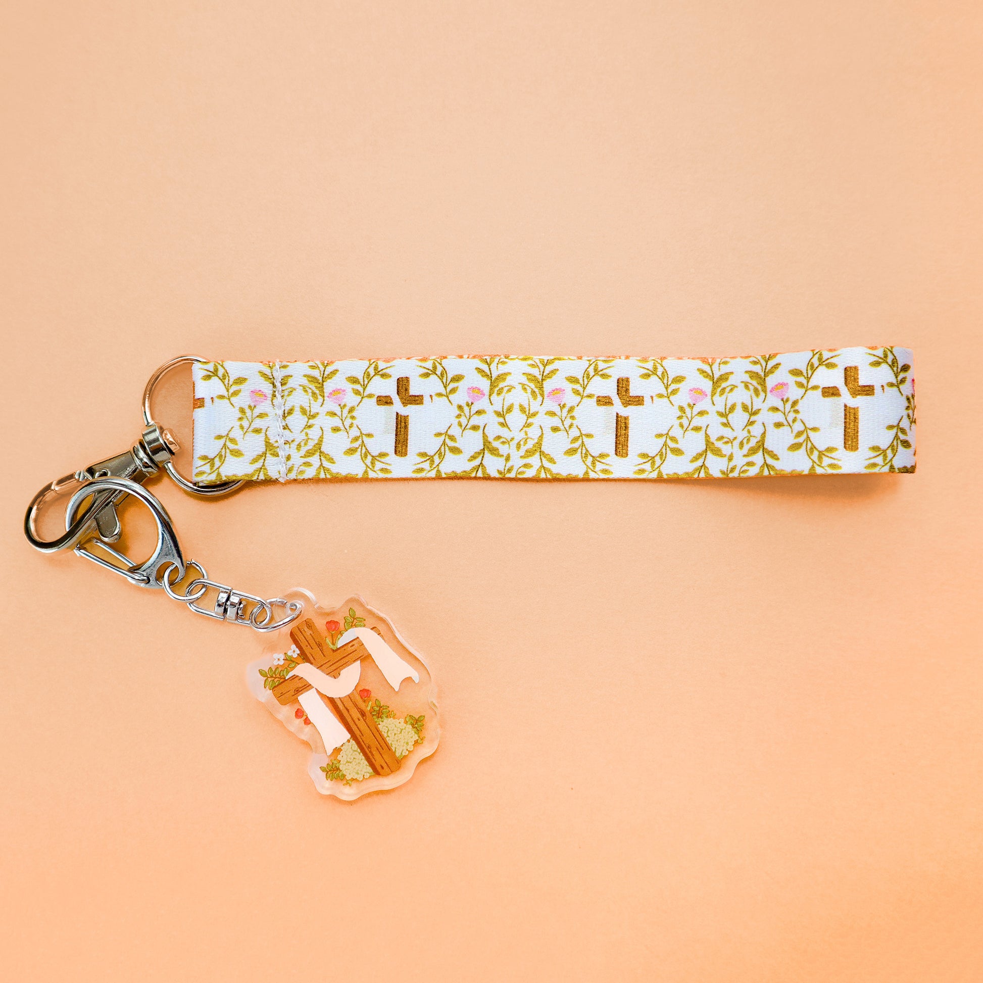 Easter Cross Lanyard Keychain features illustrations of the Holy Cross along with an acrylic charm.