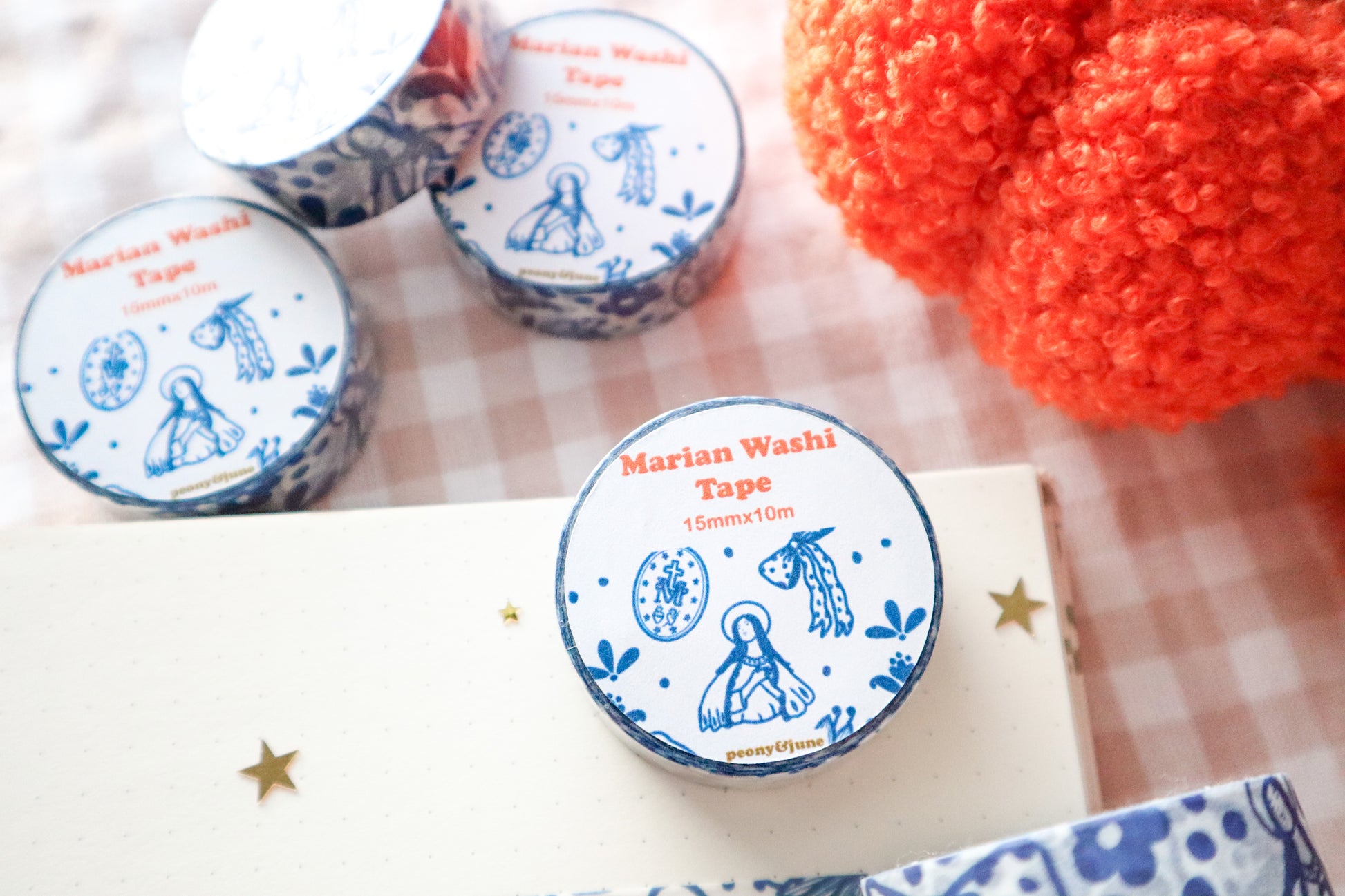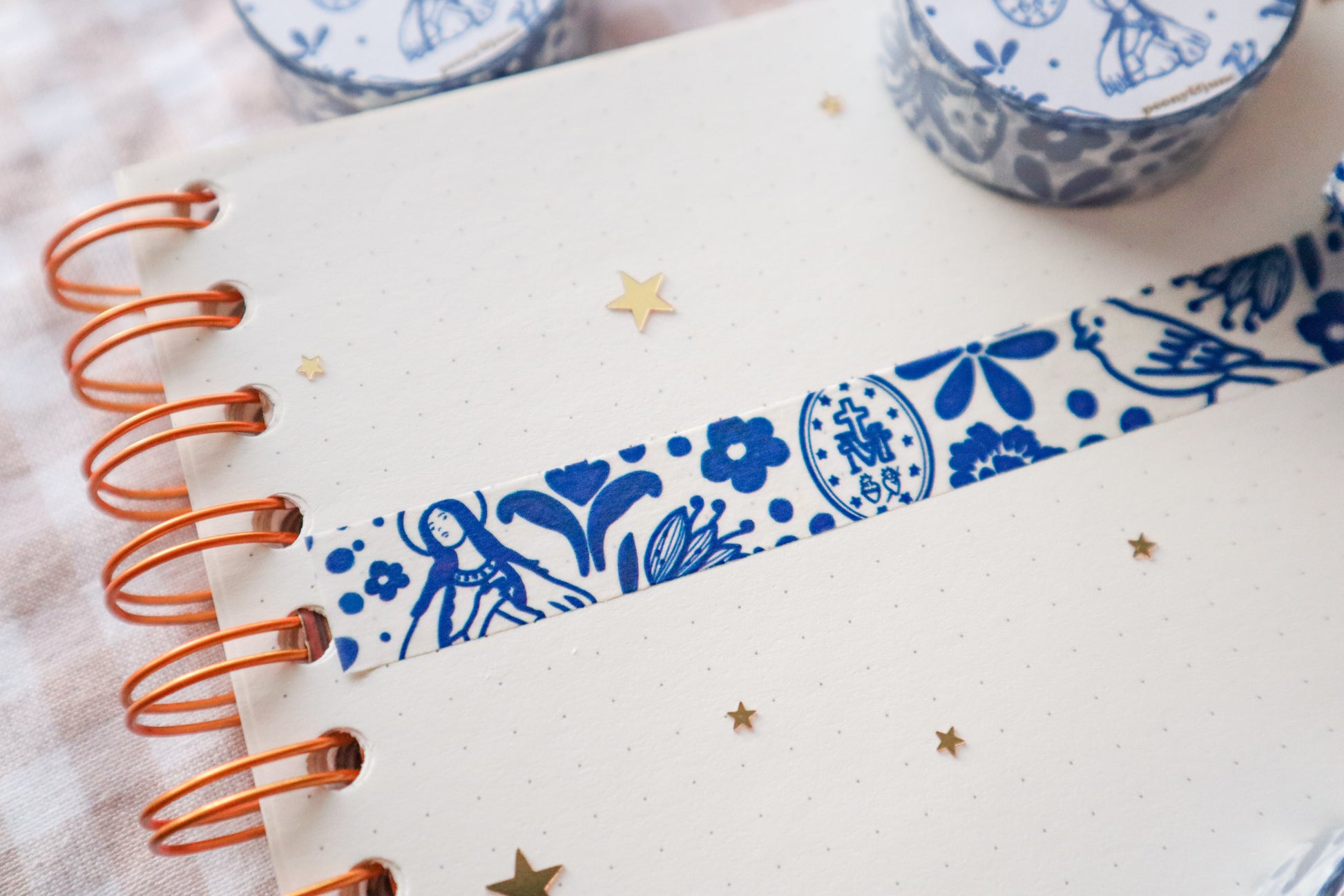 The Marian Pattern Washi Tape features a royal blue floral Marian pattern on a white background, and makes a lovely addition for journals, planners, bibles, to wrap gifts or to give away!