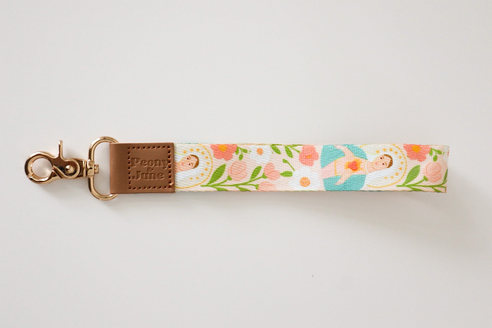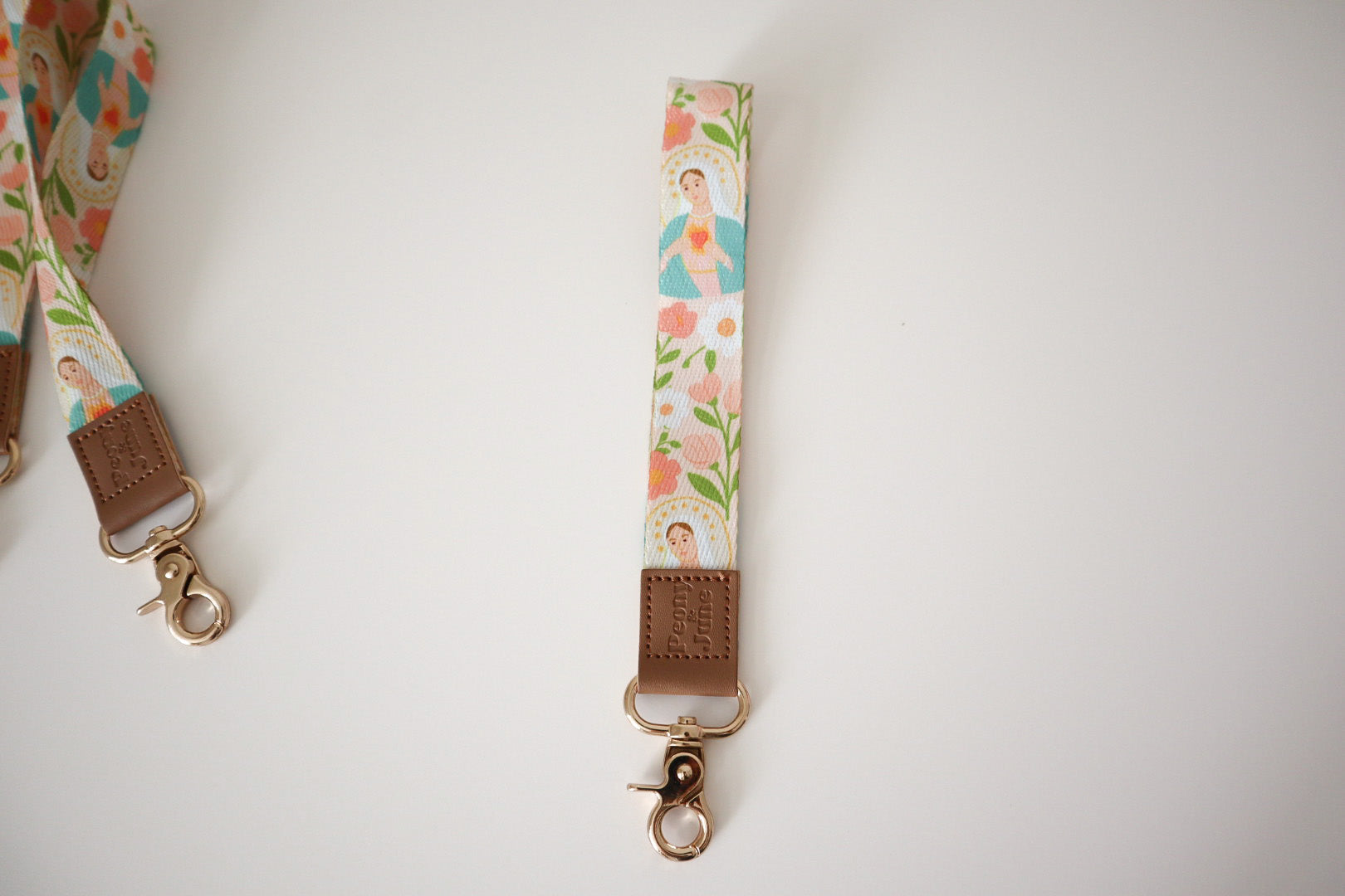 The Immaculate Heart Wristlet features an illustration of the Immaculate Heart of Mary on floral frame on a pale pink background. It makes a lovely addition for your keys, purse, wallet, as a gift... you name it!