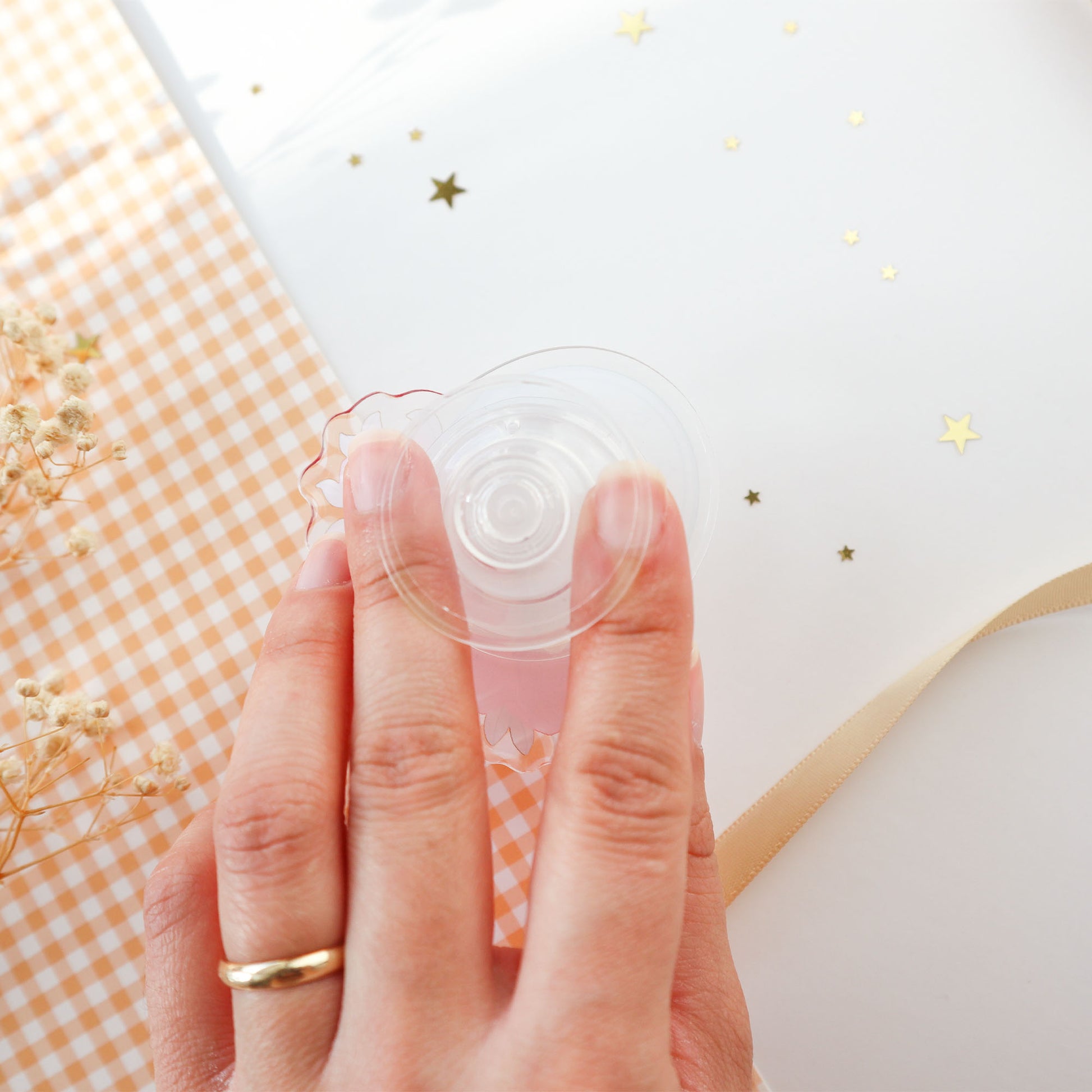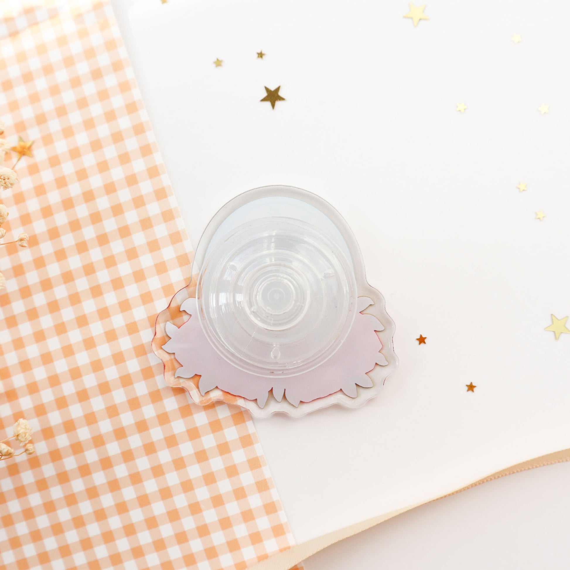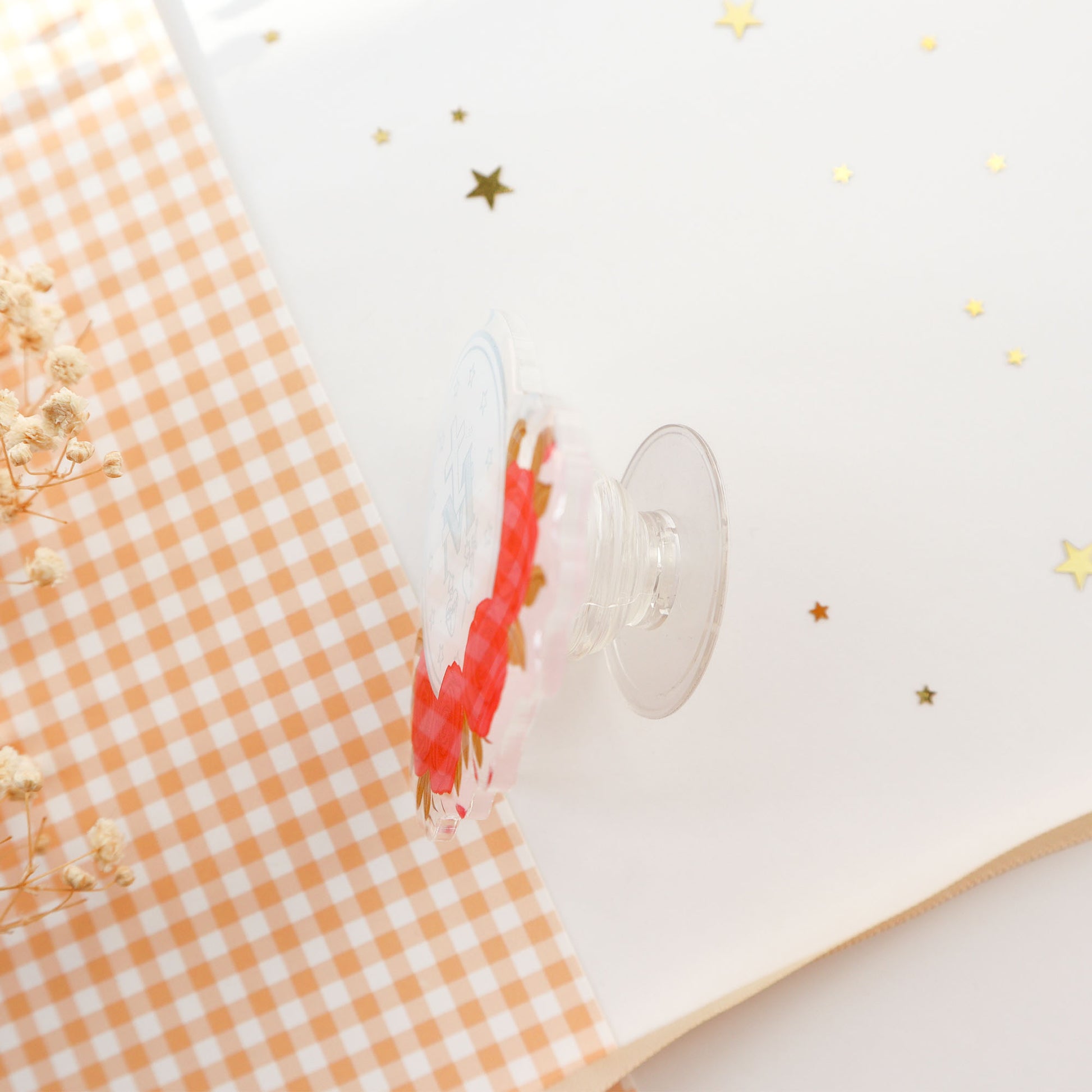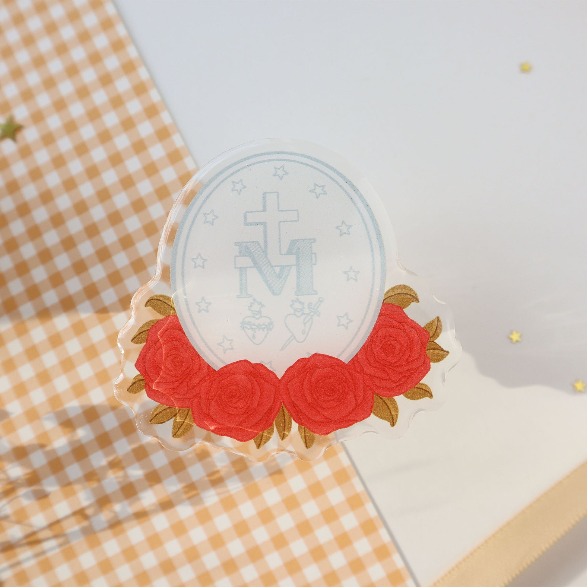 Acrylic Phone Grip featuring red floral + Miraculous Medal illustrations.