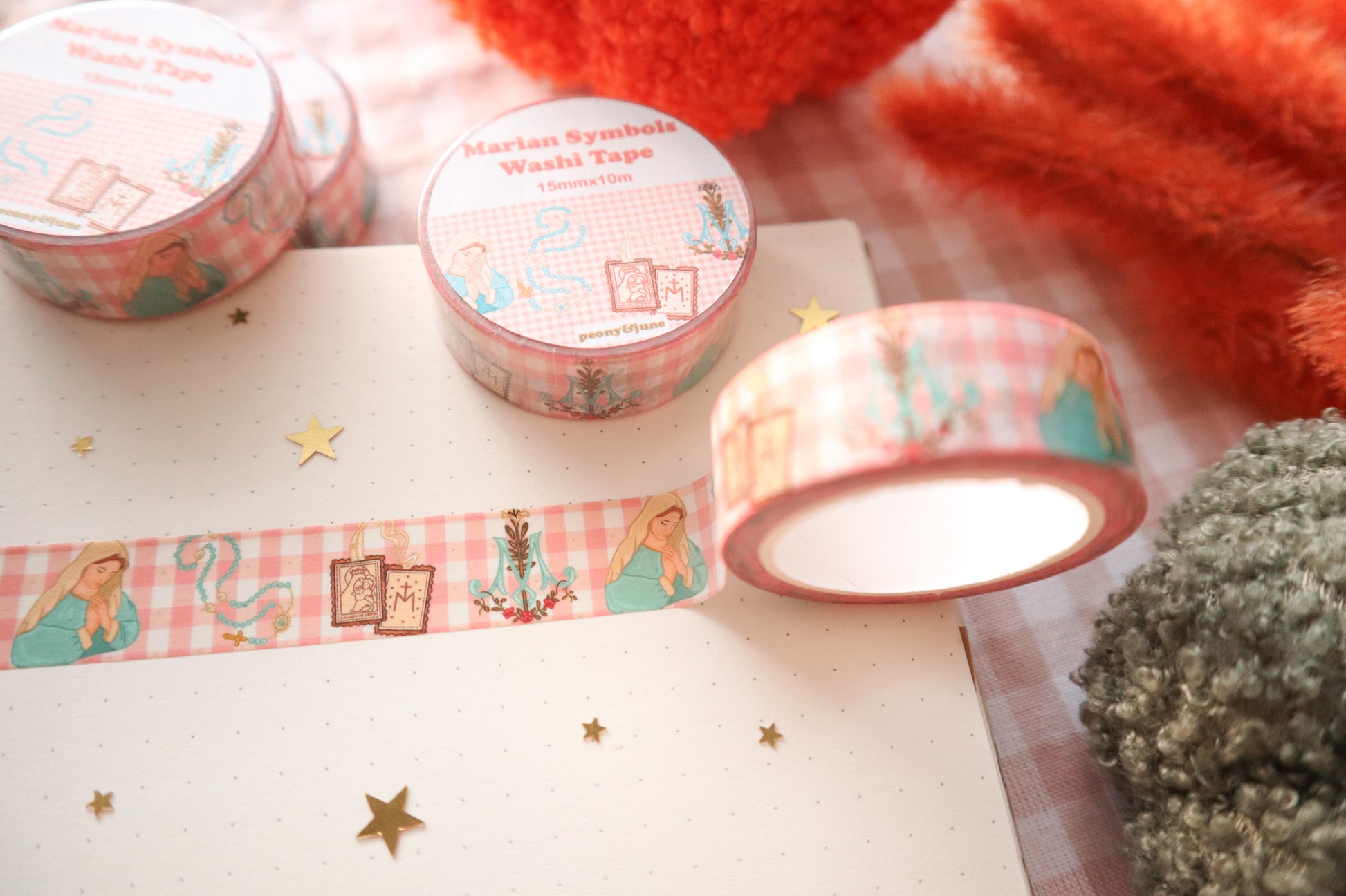 The Marian Symbols Pink Washi Tape features symbols related to the Blessed Mother on a pink plaid background and makes a lovely addition for journals, planners, bibles, to wrap gifts or to give away!