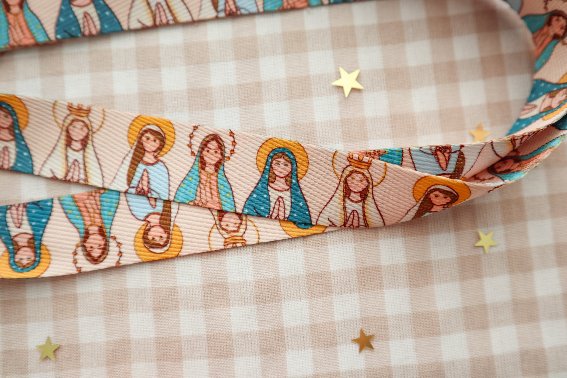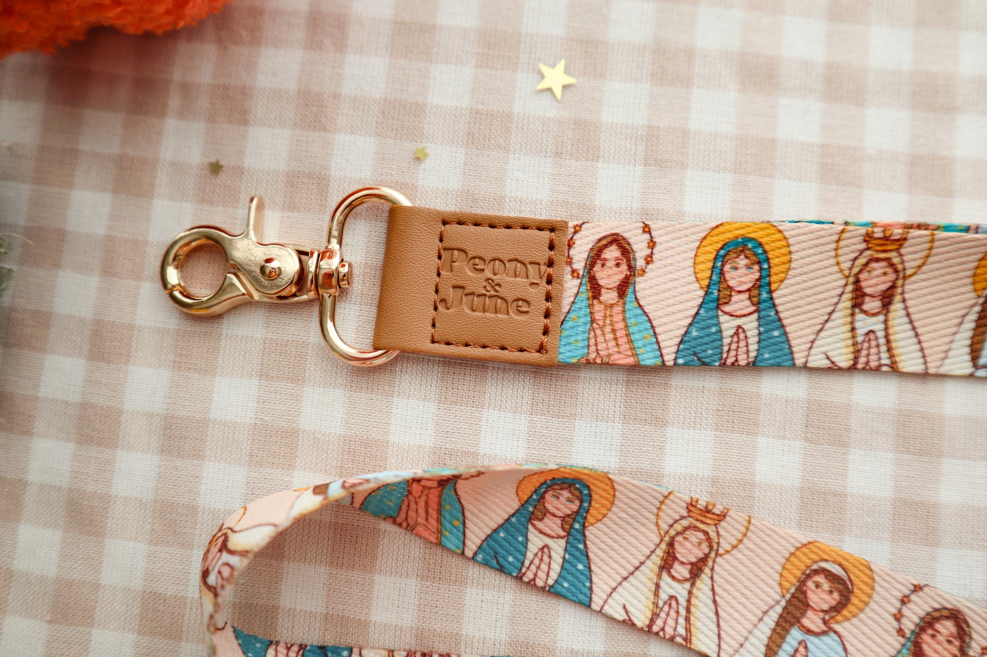 This lanyard features illustrations of the Blessed Mother and makes a lovely addition as a functional keychain.