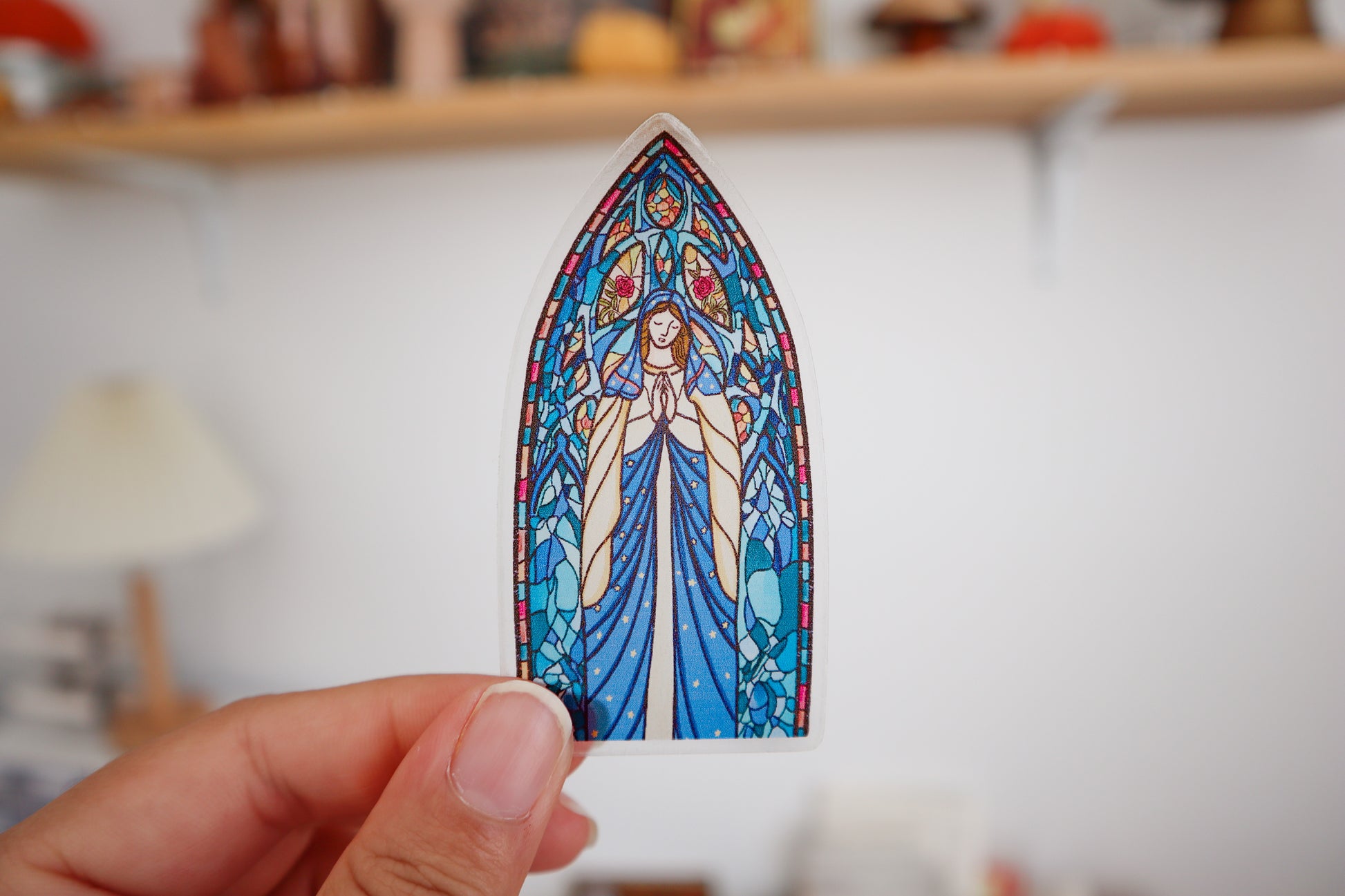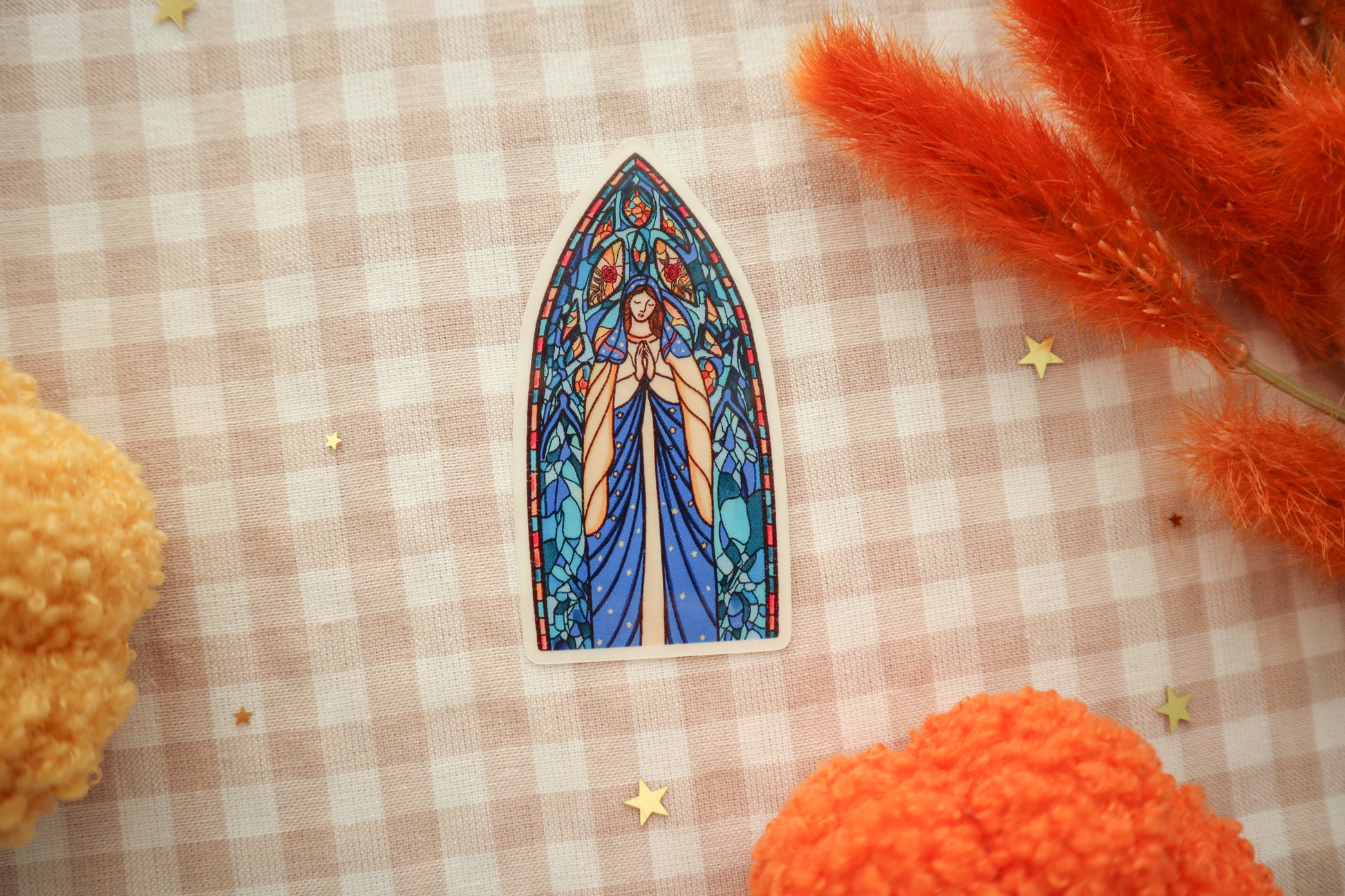 The Our Lady Stained Glass Clear Vinyl Sticker features an illustration of Our Lady in stained glass.