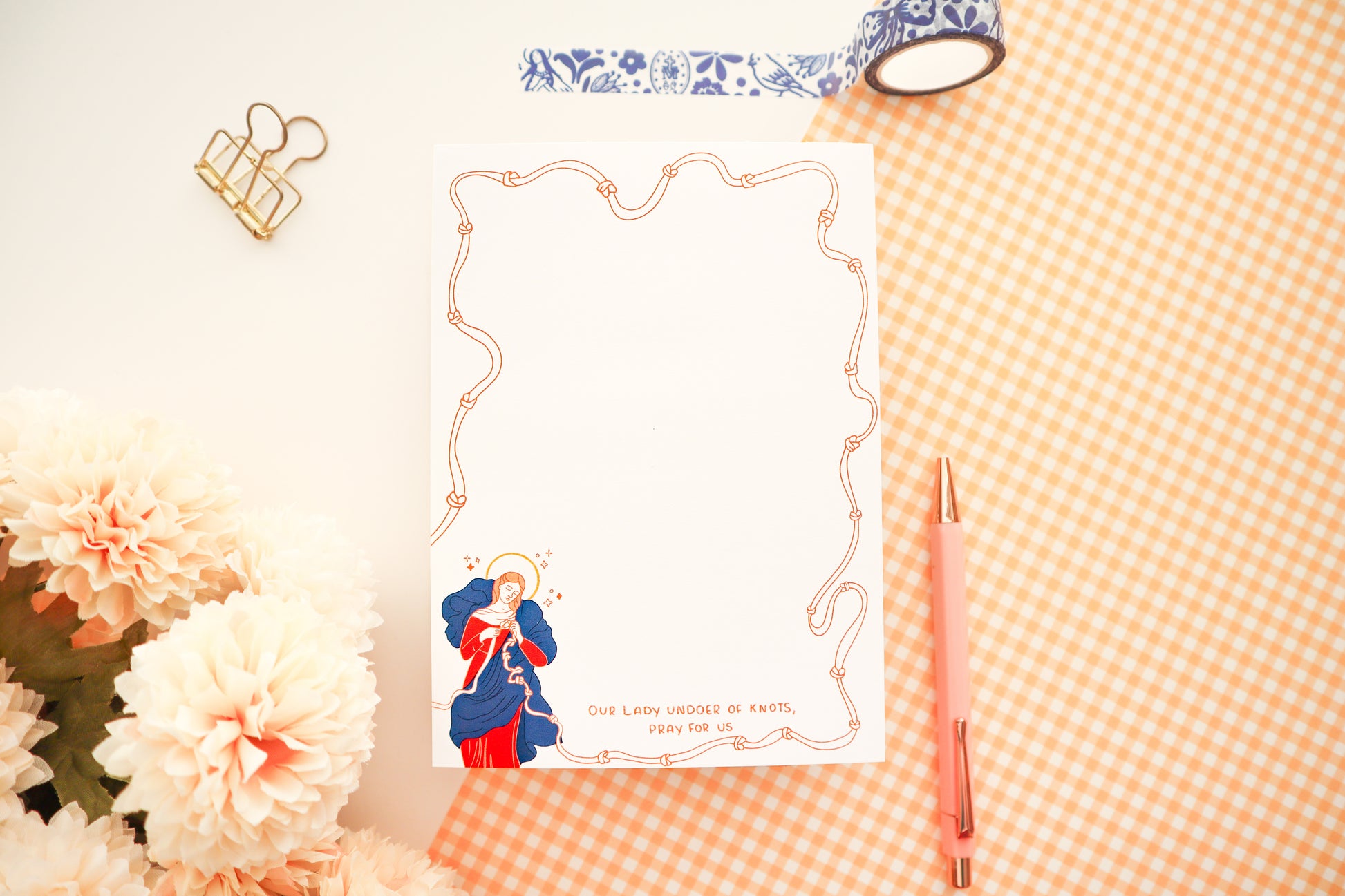 All-purpose notepad featuring an illustrations of the marian devotion Our Lady Undoer of Knots