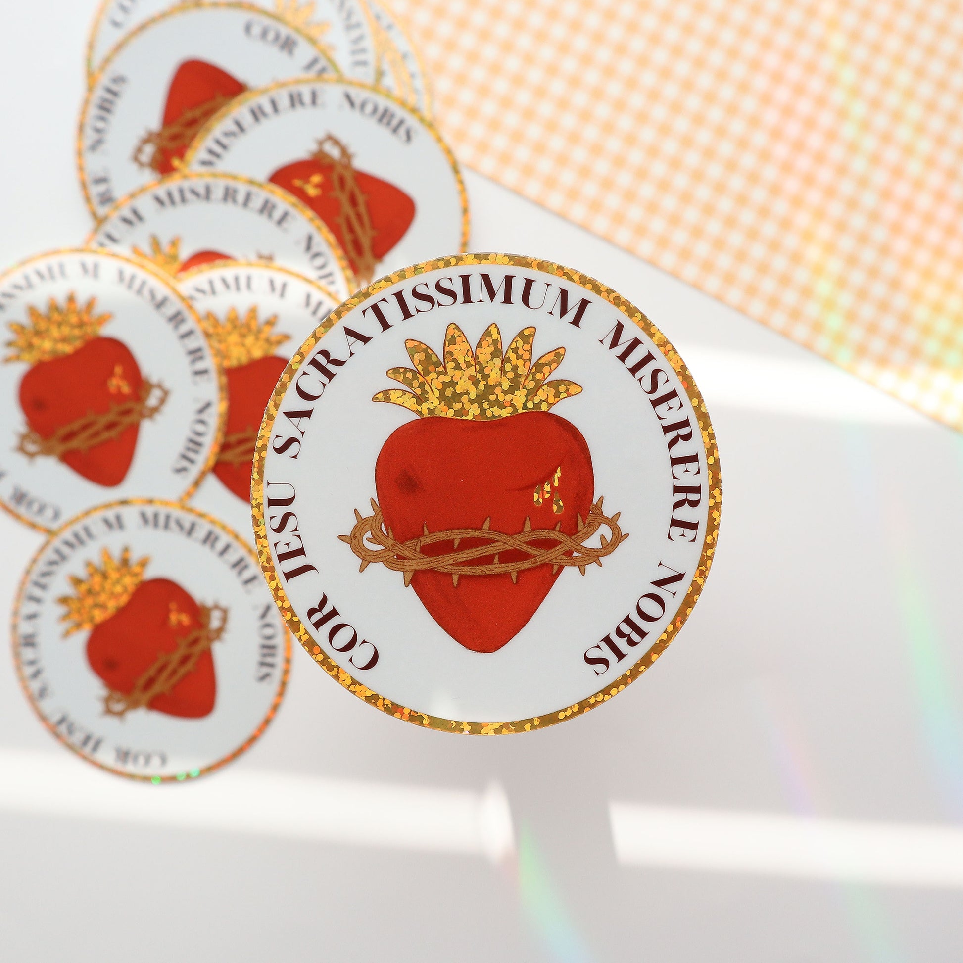 This sticker features an illustration of the Sacred Heart of Jesus along with the words in Latin "Cor Jesu sacratissimum miserere nobis", which Means "Most Sacred Heart of Jesus have mercy on us" along with gold glitter details.