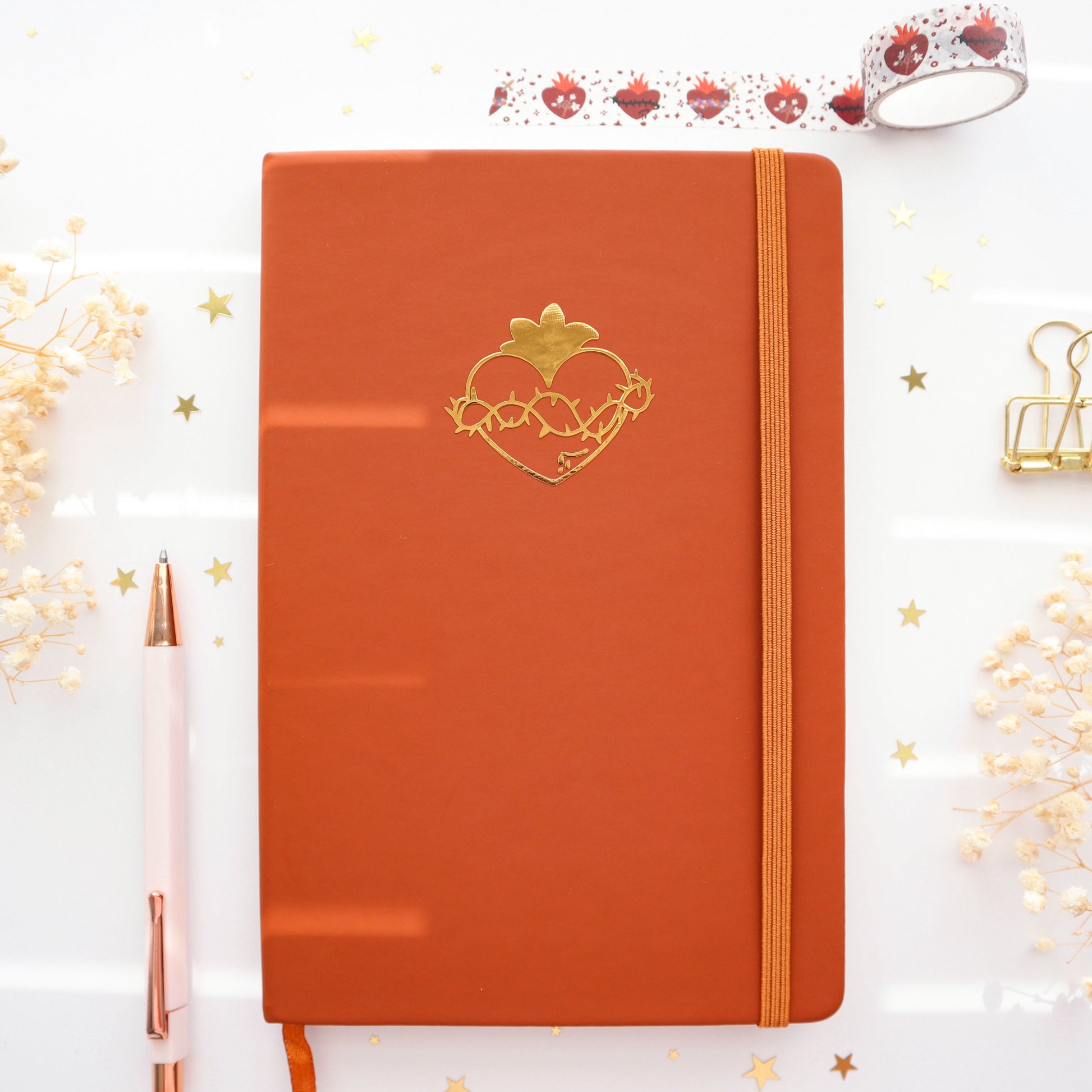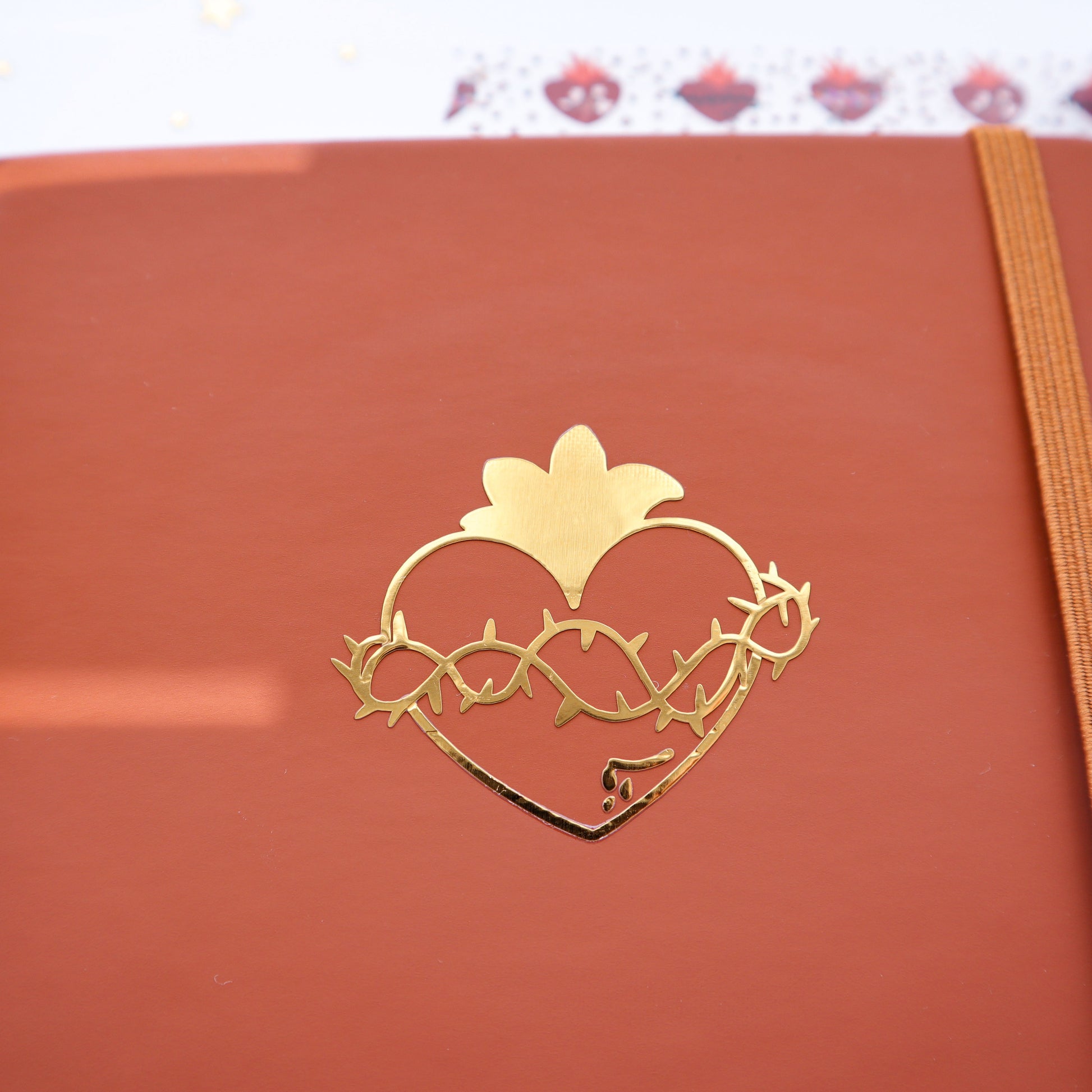 Perfect for journaling, studying, for quick notes or even as a thoughtful gift for a loved one, this leatherette notebook features an illustration of the Sacred Heart of Jesus, which is pressed by hand using a heat press and gold foil.