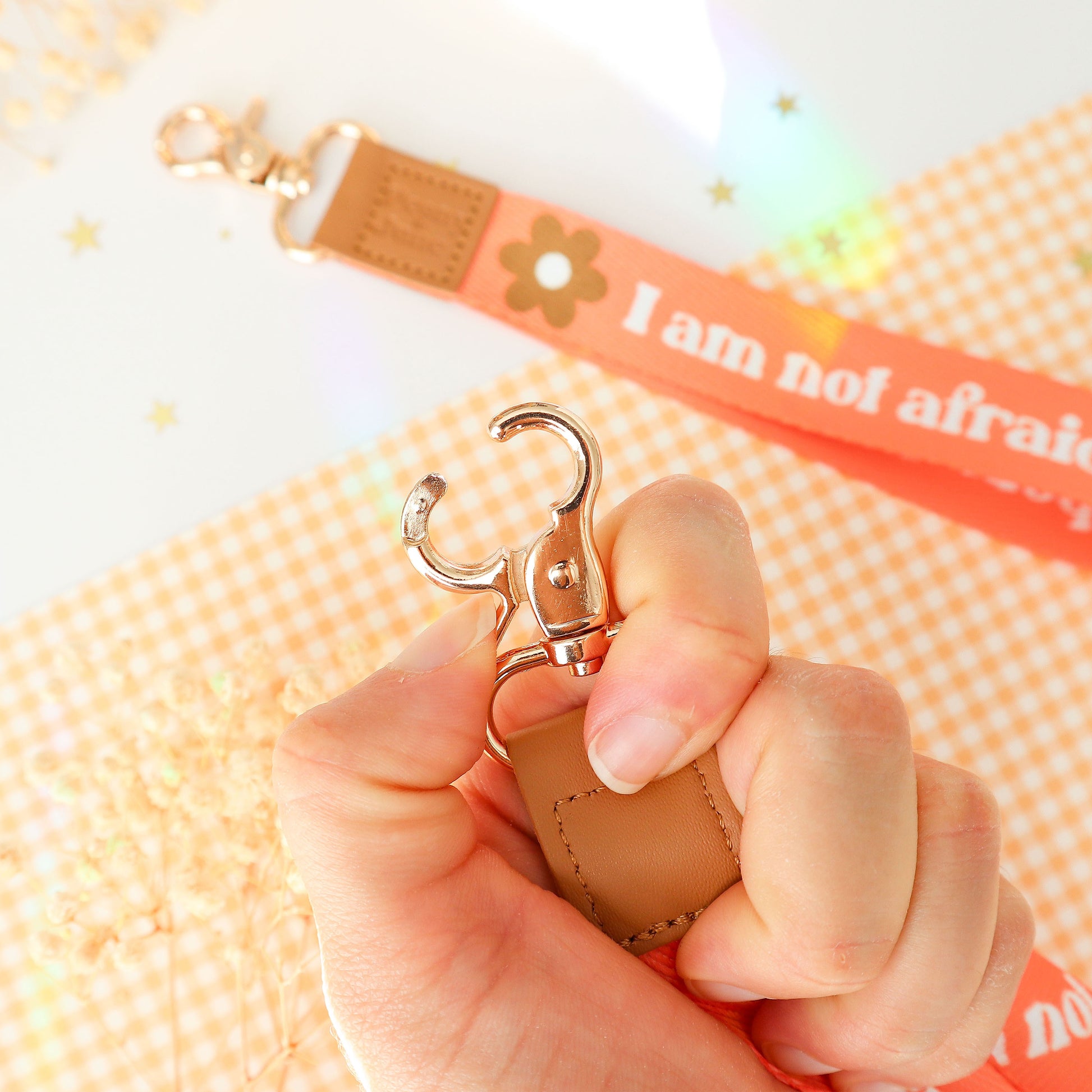 This Wristlet keychain features a quote by St Joan of Arc: "I am not afraid, I was born to do this." on an orange background along with flowers. It makes a lovely addition for your keys, purse, as a gift, you name it!
